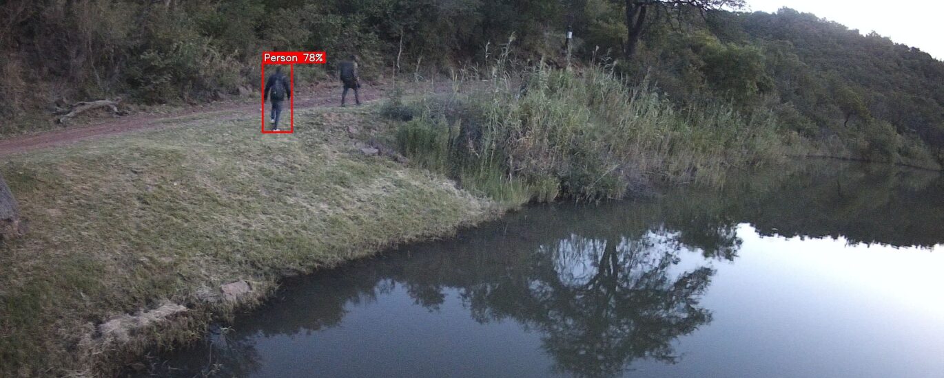 At exactly 19:06, two individuals appeared on the property’s perimeter camera, walking along the dam wall toward the lodge buildings. Within seconds, the property owner received a Telegram alert with a photo, a bounding box around the detected person, and a 78% confidence score. No false alarm. No guesswork. Just a clear, verified threat that demanded action.